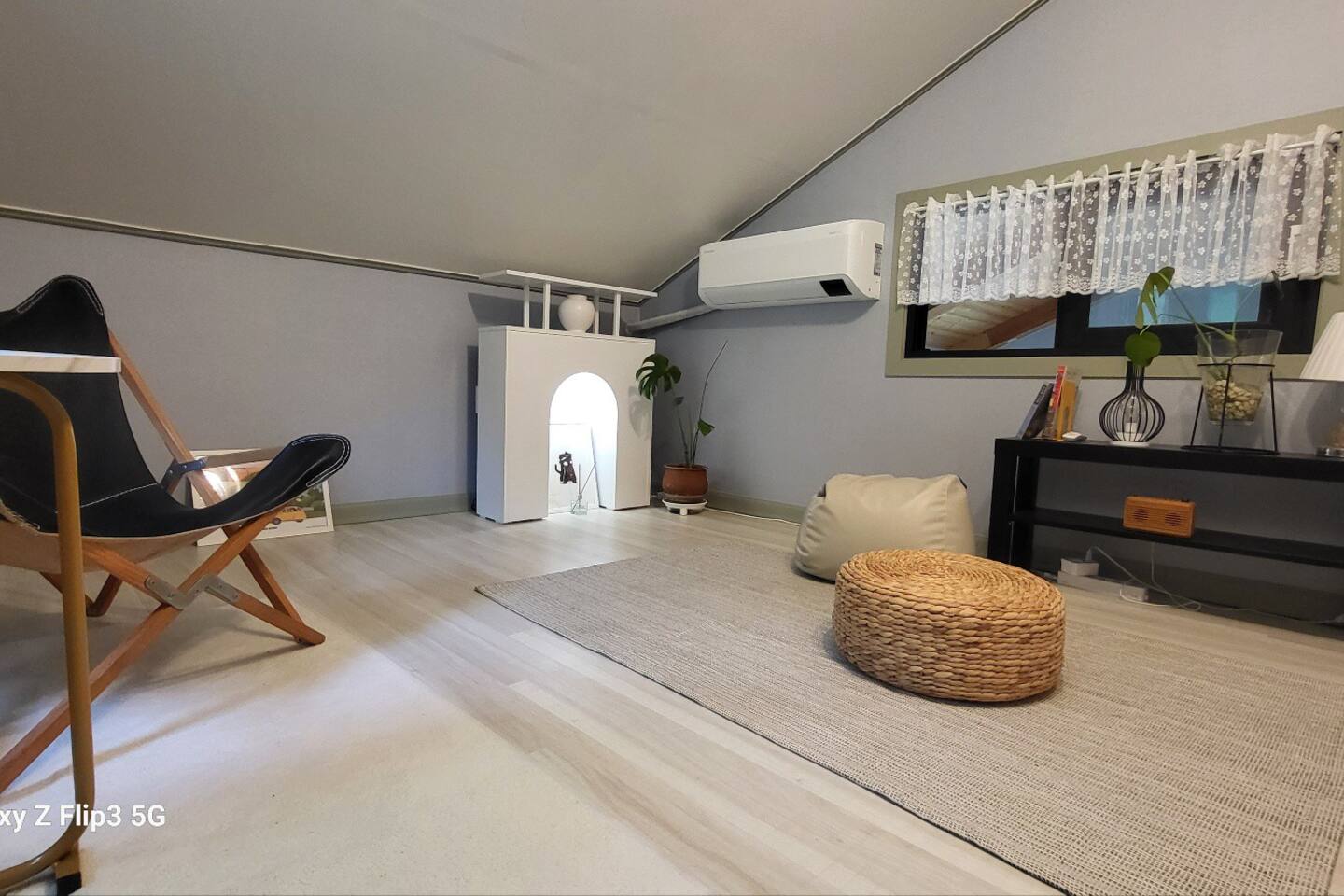 There is a sofa bed and a small table in the attic