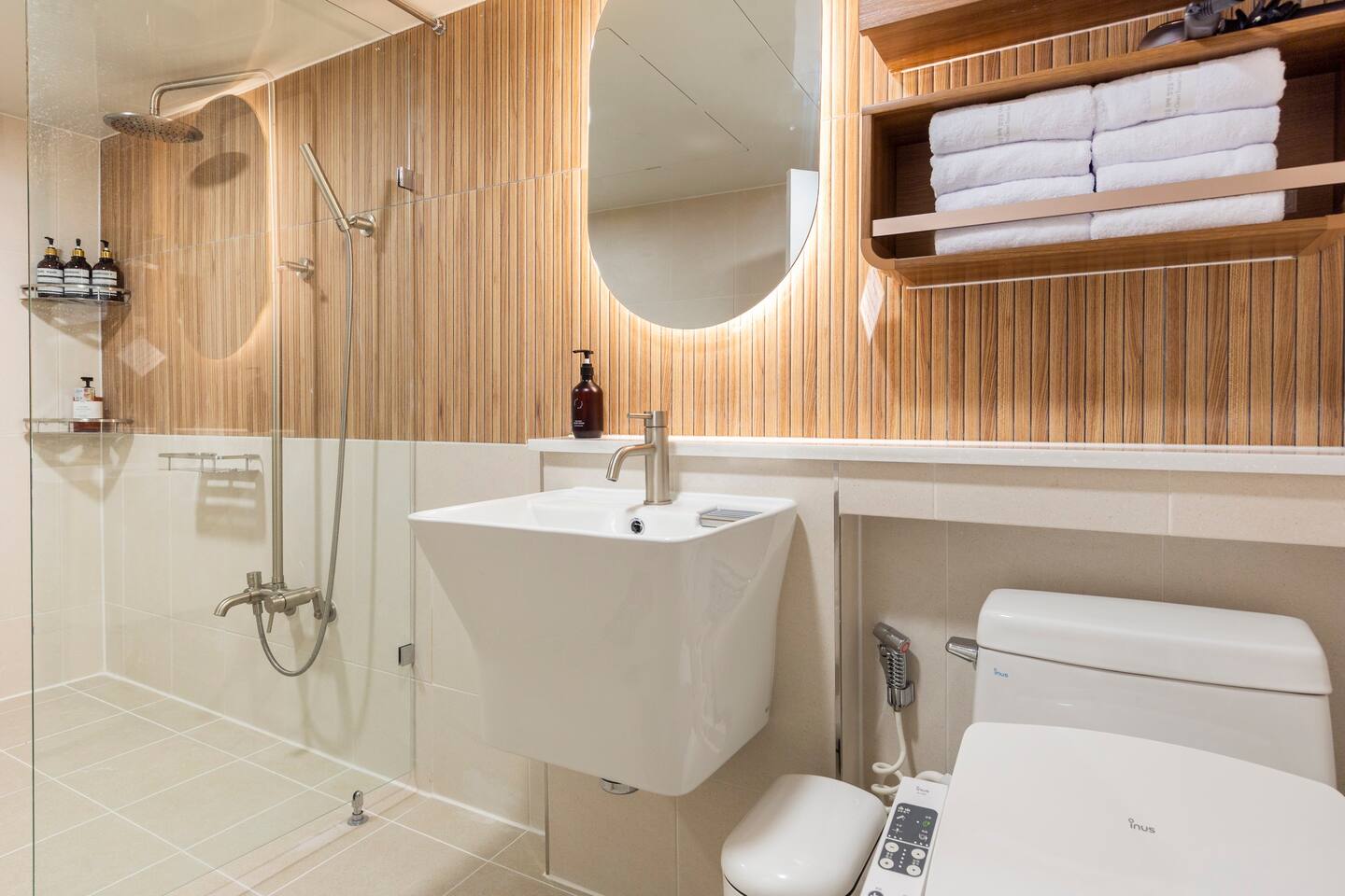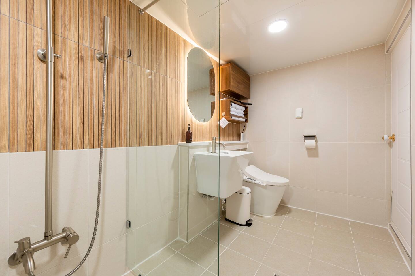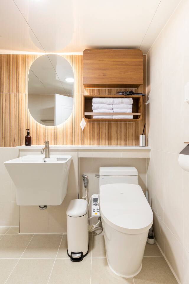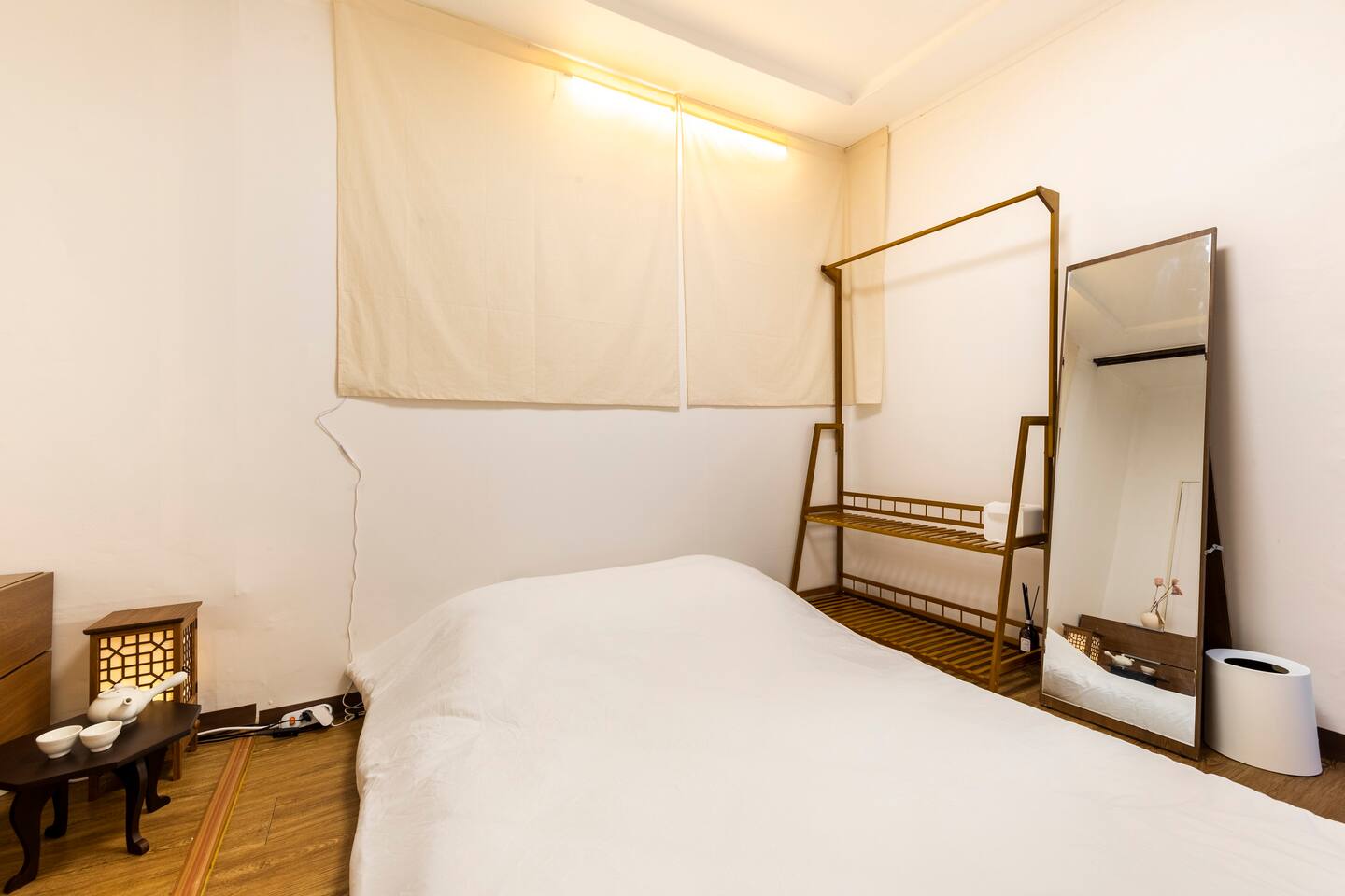 비품 : 퀸사이즈 토퍼매트리스, 슈퍼싱글 침대, 화장대, 행거, 전통 무드등