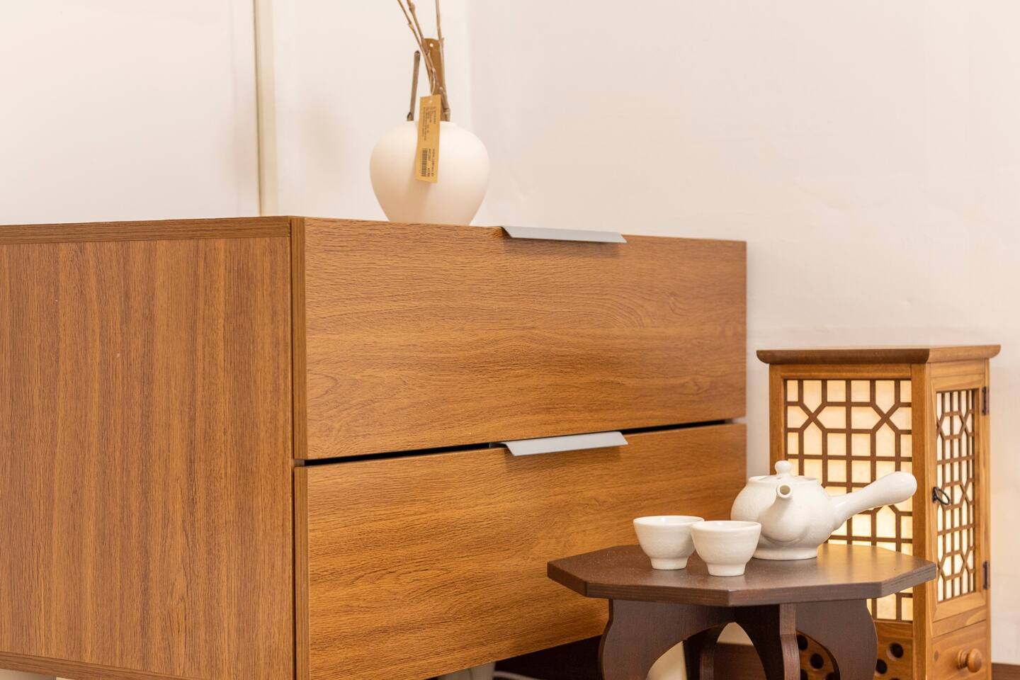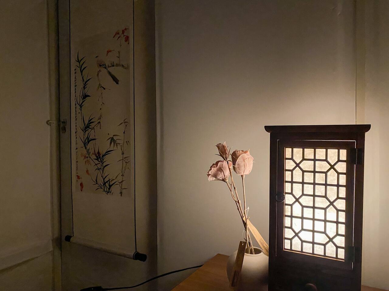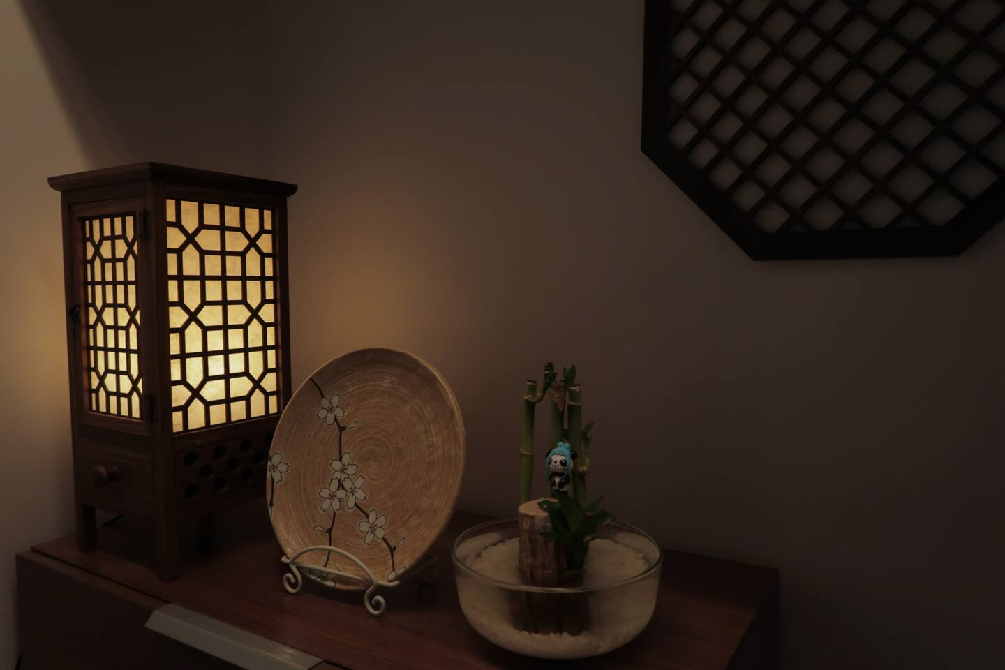 동양적 아름다움을 품은 방입니다. 동양풍의 족자와 전통문양 호롱등으로 꾸며져 있습니다. 한국적인 포근한 아름다움을 느껴보세요.
