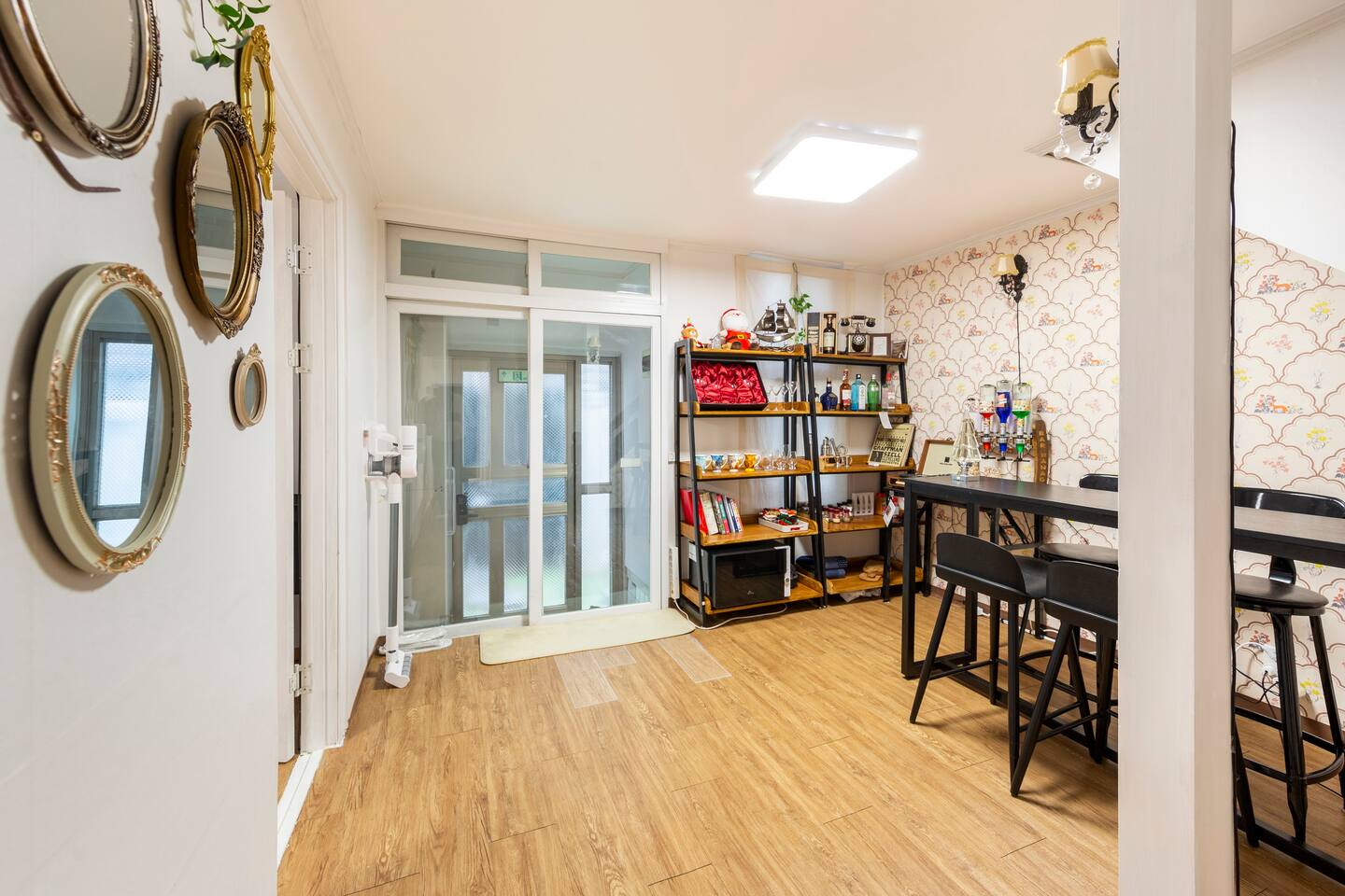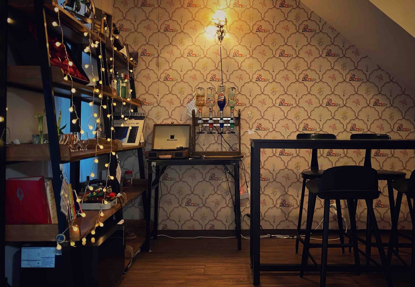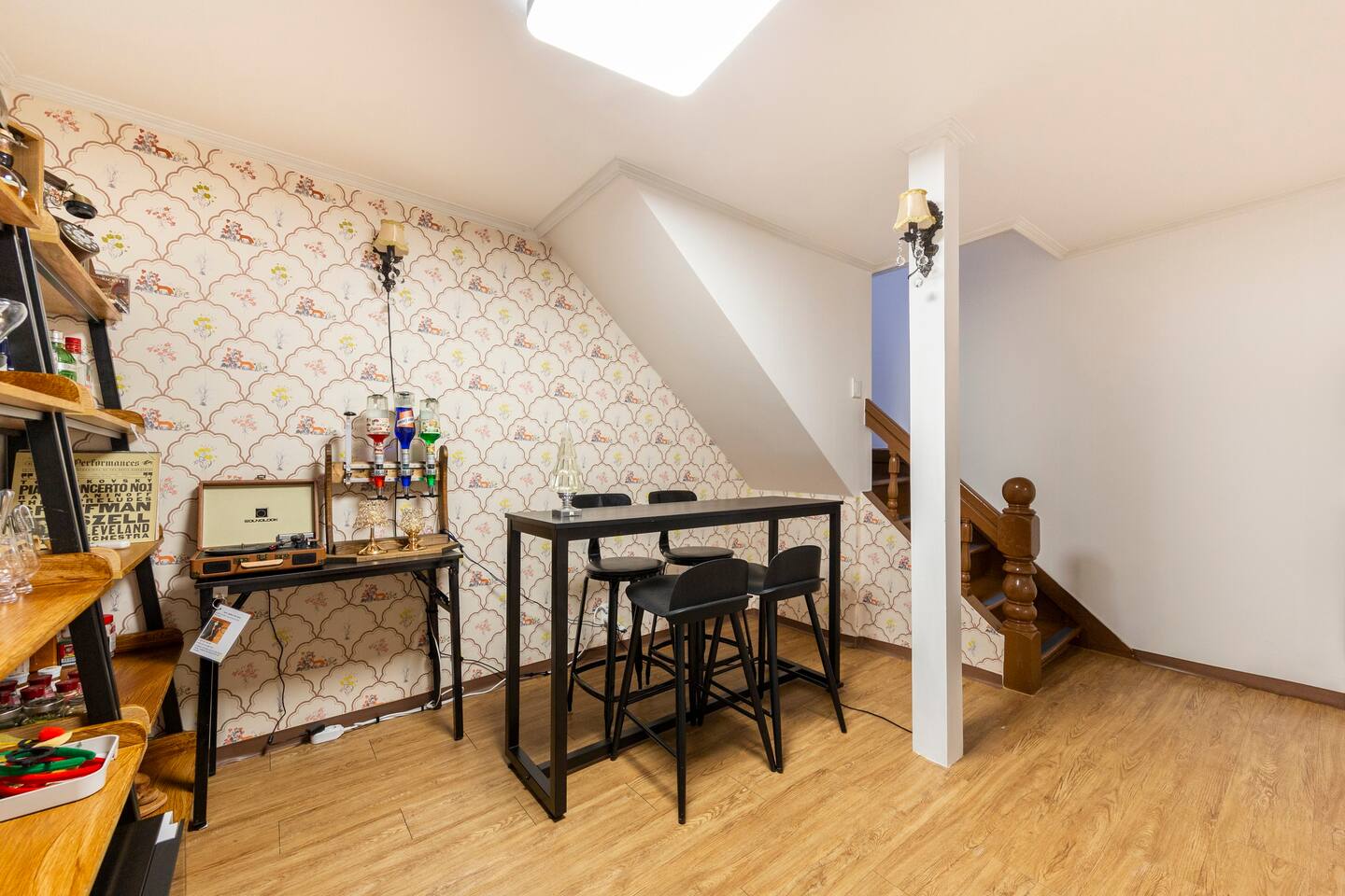 적산가옥 다미가 지어진 개화기 시대 양옥을 재현했습니다. 홈바, LP플레이어, 고동색 계단, 레트로와 동양적 미가 가미된 벽지, 엔틱 거울로 구성된 포토존, 개화기의 분위기를 그대로 살린 다양한 소품들이 비치되어 있습니다.