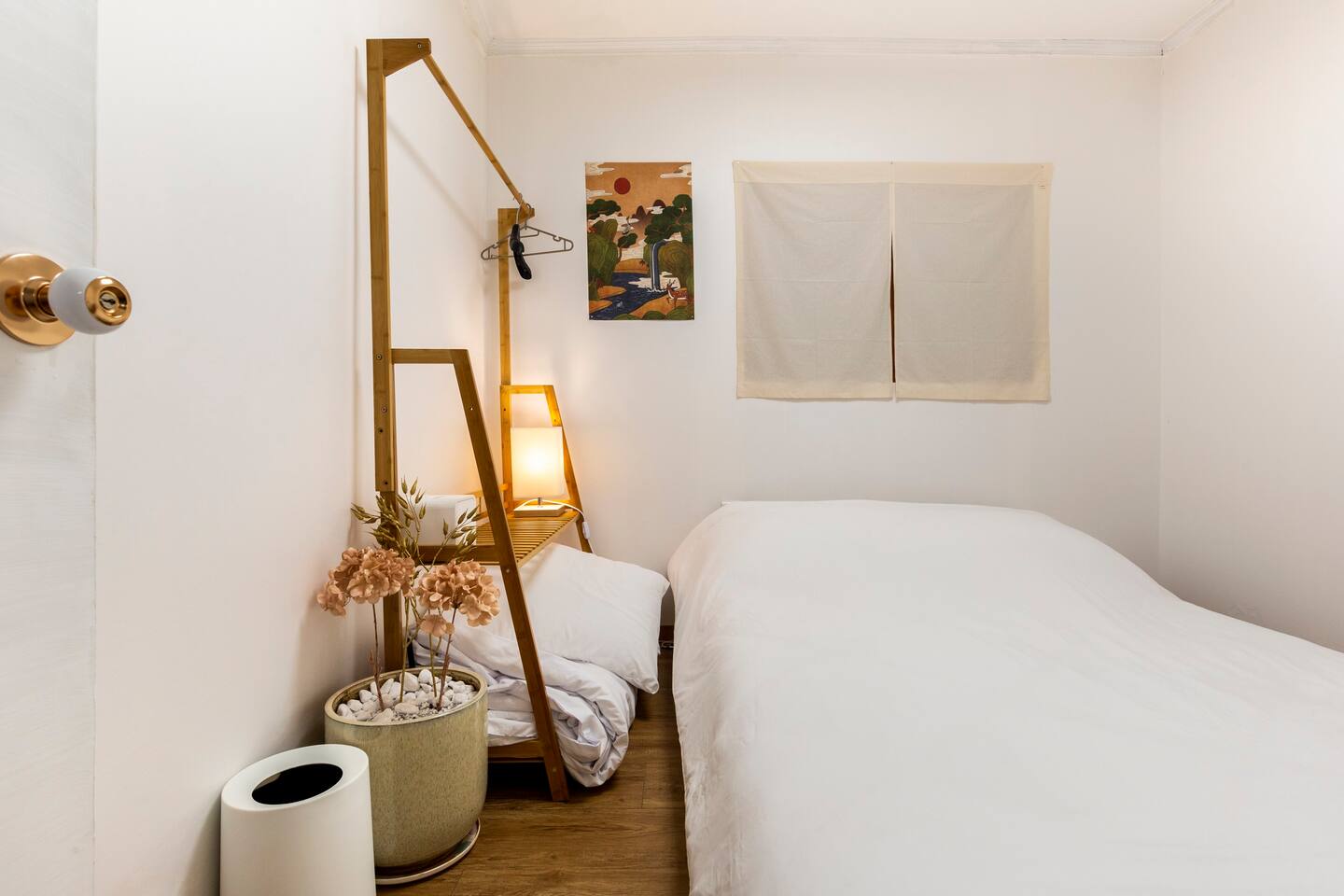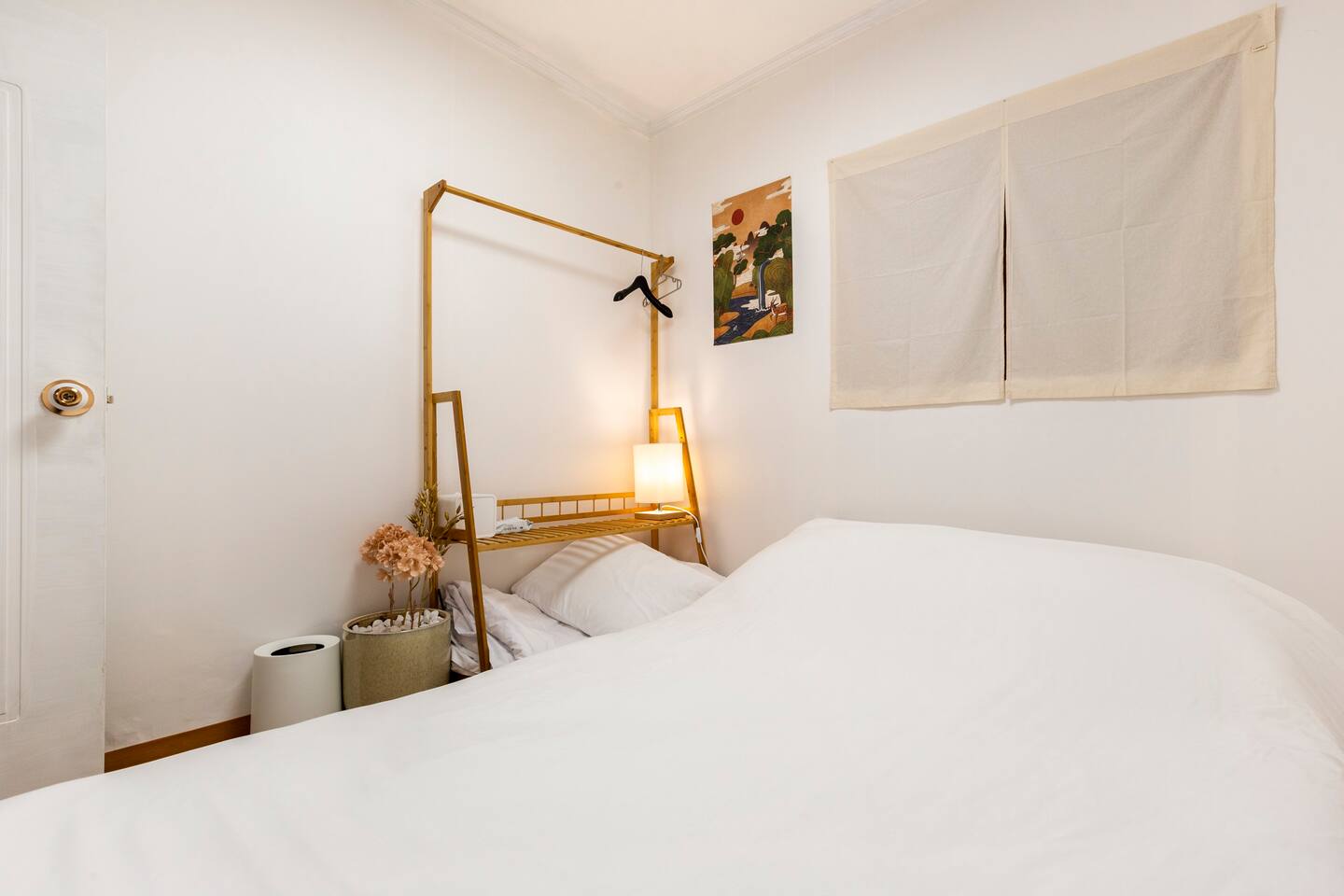 퀸사이즈 침대와 행거가 배치된 아담한 방입니다. 지인들과의 즐거운 시간도 좋지만, 잠깐은 편히 쉬는 시간도 필요하죠 :)