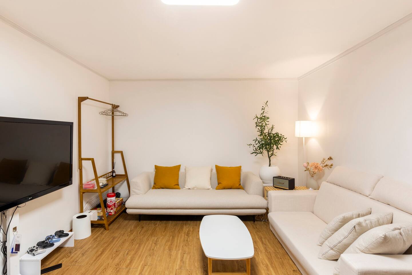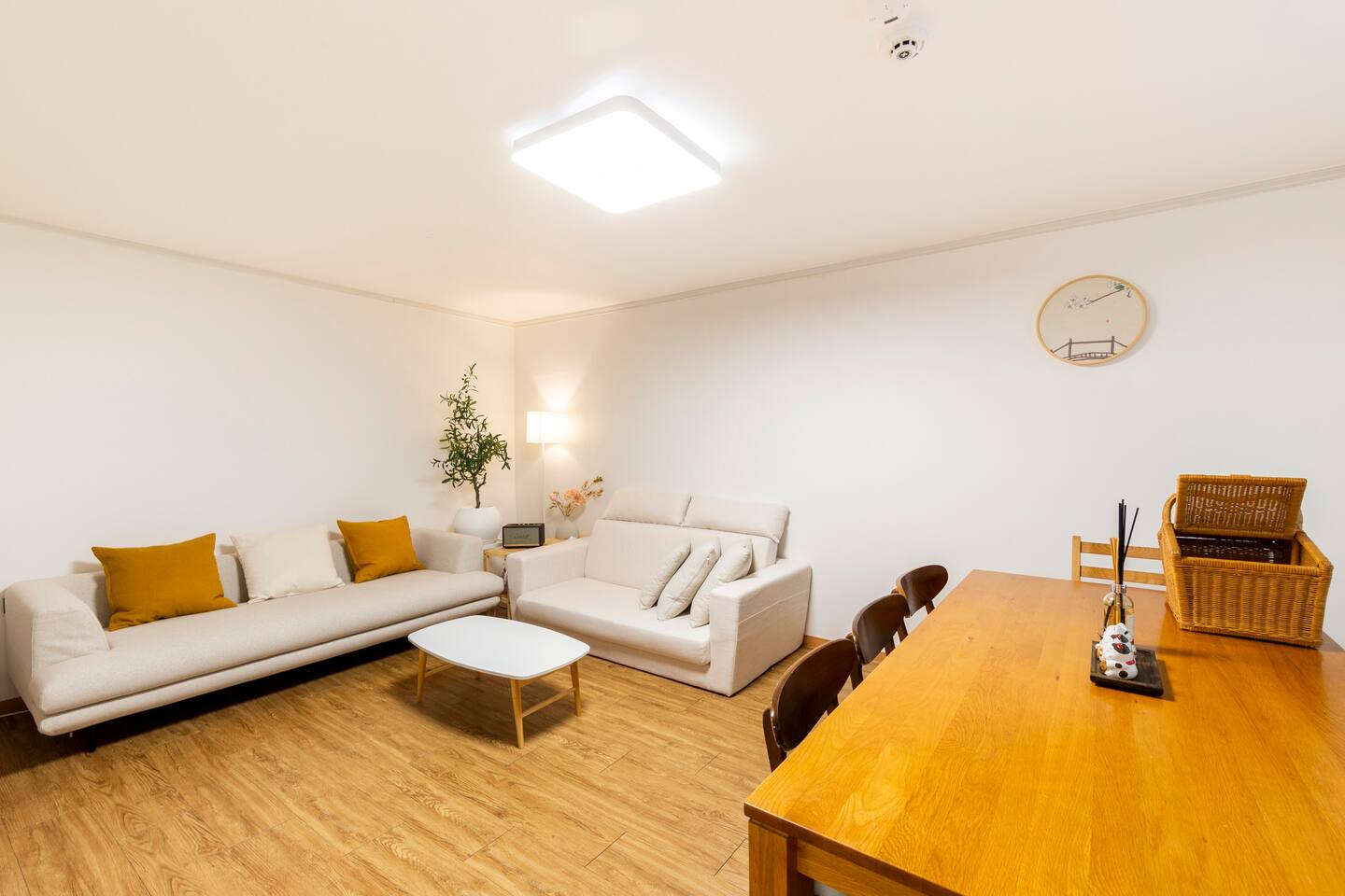 모던함과 동양적 미를 조화시킨 다미의 메인 방입니다. 가장 넓으며 식탁, 쇼파 2개, 각종 즐길거리가 배치되어 있습니다.