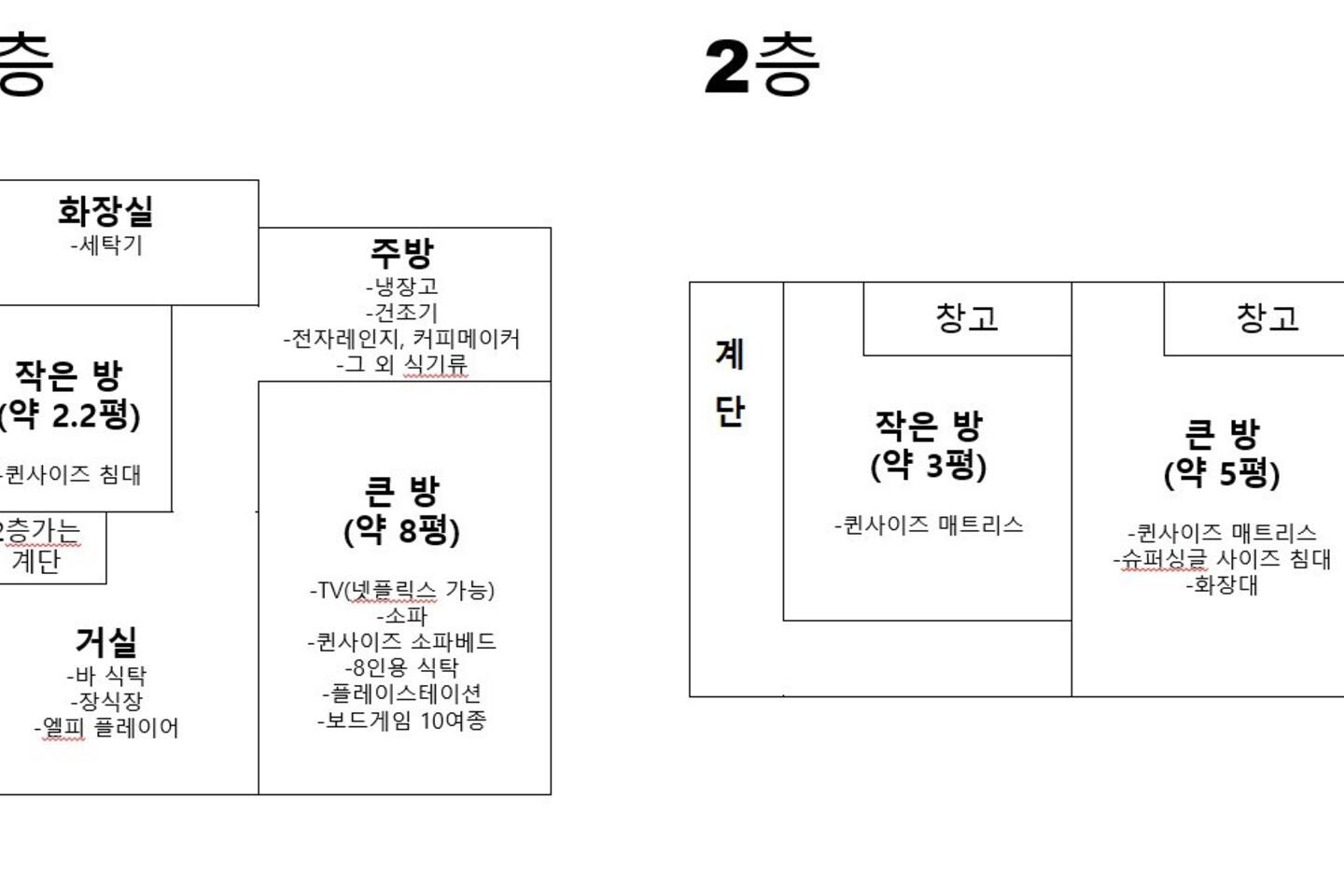 - 방 4개(퀸침대3개, 슈퍼싱글침대1개), 1층 14평/2층 10평