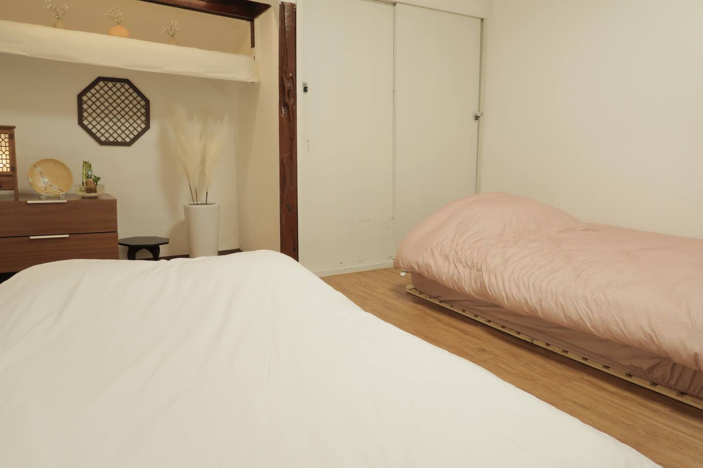 동양풍의 소품과 대들보 장식 등, 한국적 멋이 스며들어 있는 방입니다. 한국적 미와 모던함이 공존하는 넓은 공간에서 행복한 시간을 보내세요.
