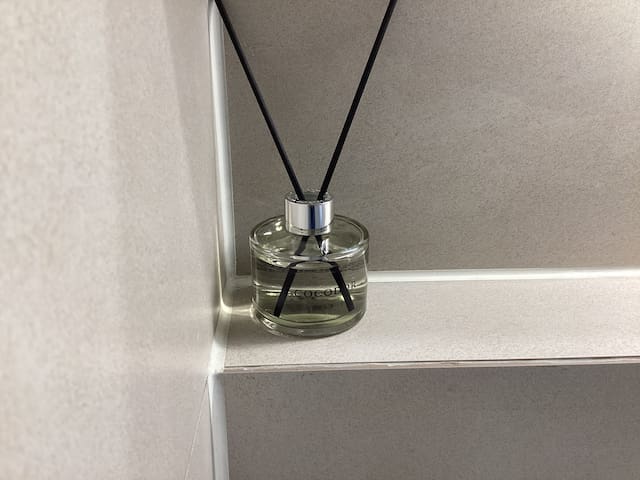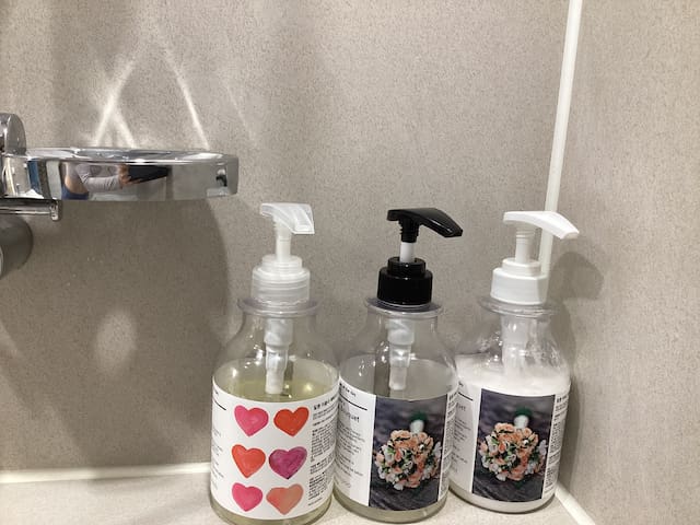 In the bathroom, you will find shampoo, conditioner, body wash, hand soap, hand cream, toothpaste, towels, a hairdryer, toilet paper, sanitary pads, dental floss, soap, and a comb.