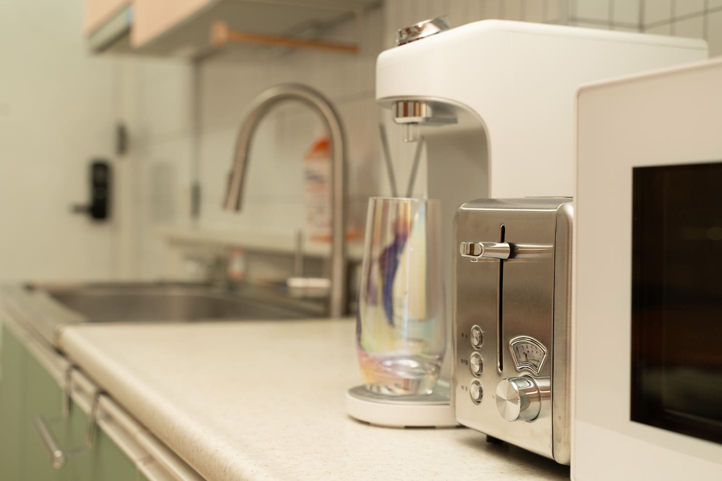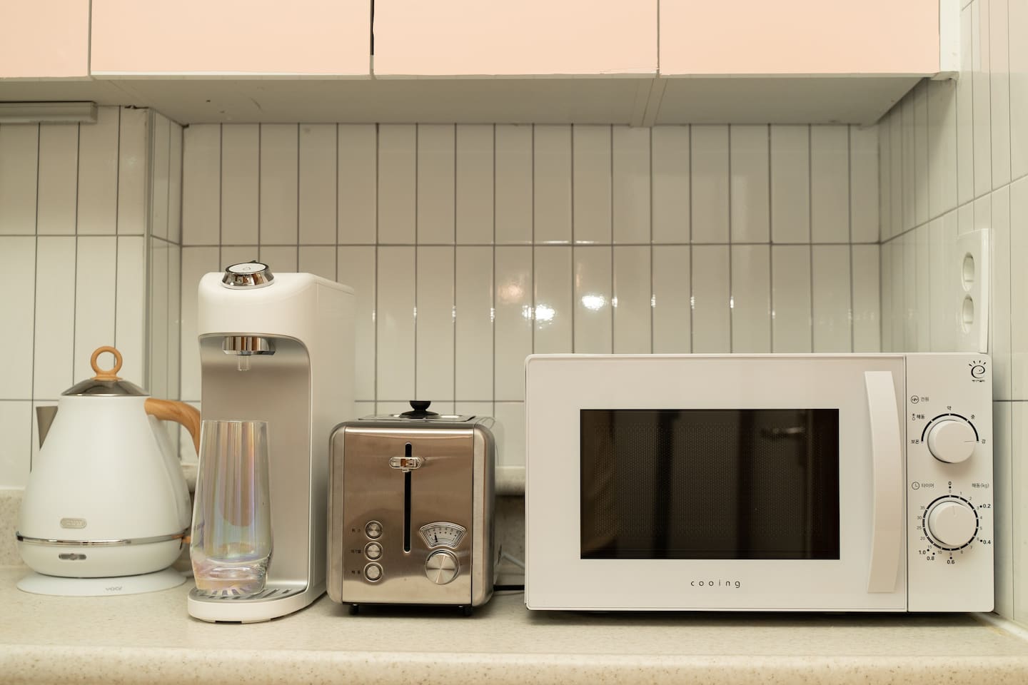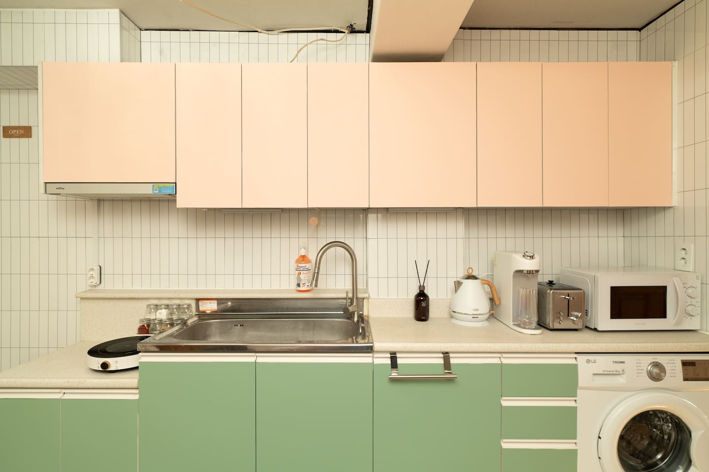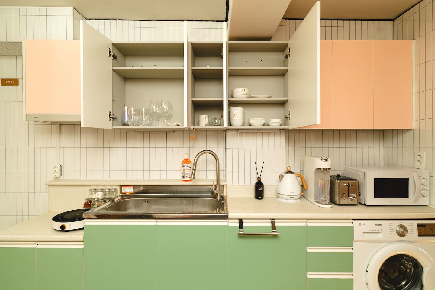 ✔ Living Room and Kitchen: You can comfortably cook in the kitchen. Induction cooktop, water purifier, microwave, toaster, various dishes, cups, and wine glasses are provided for your convenience.