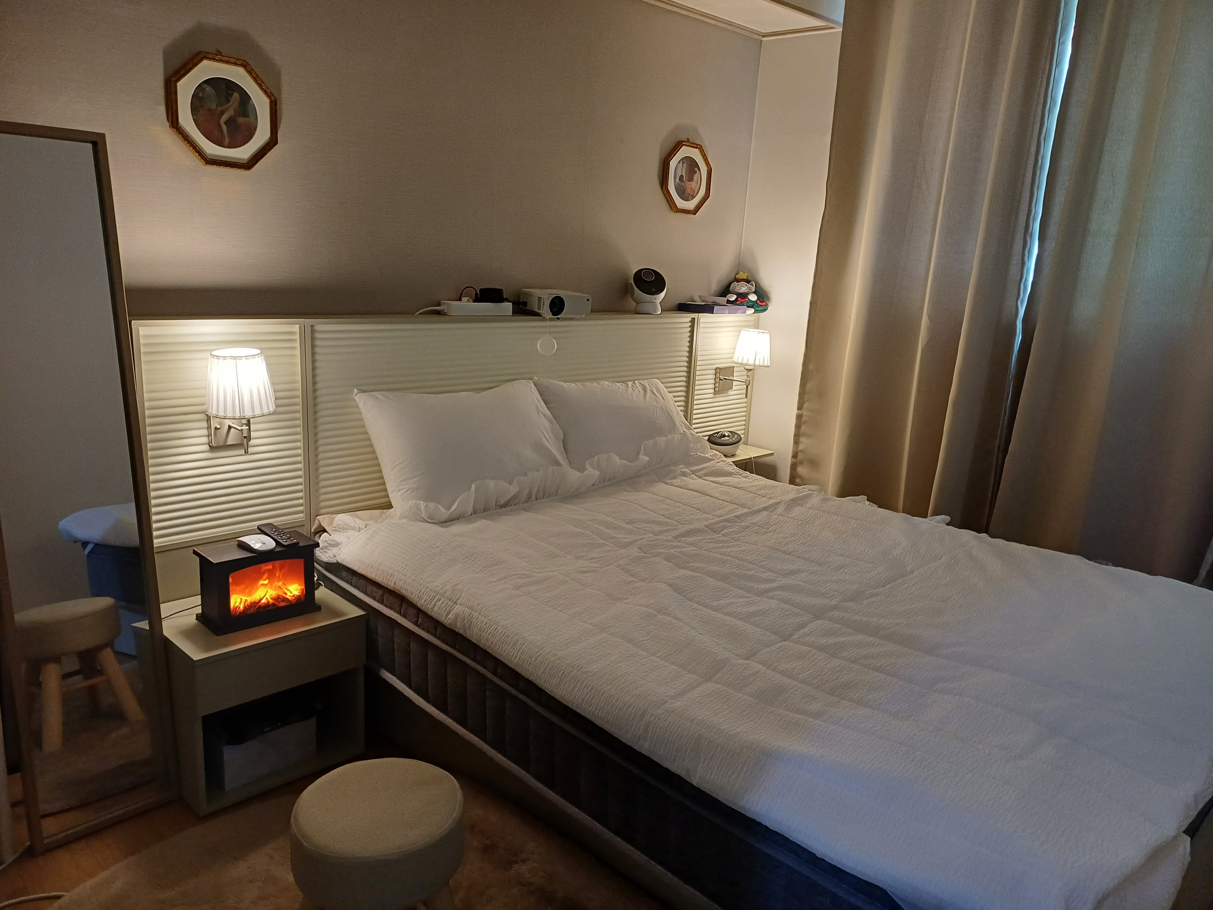 The accommodation is provided with a mobile smart TV and a beam projector, a bed with hotel-style bedding and LED mood lights,