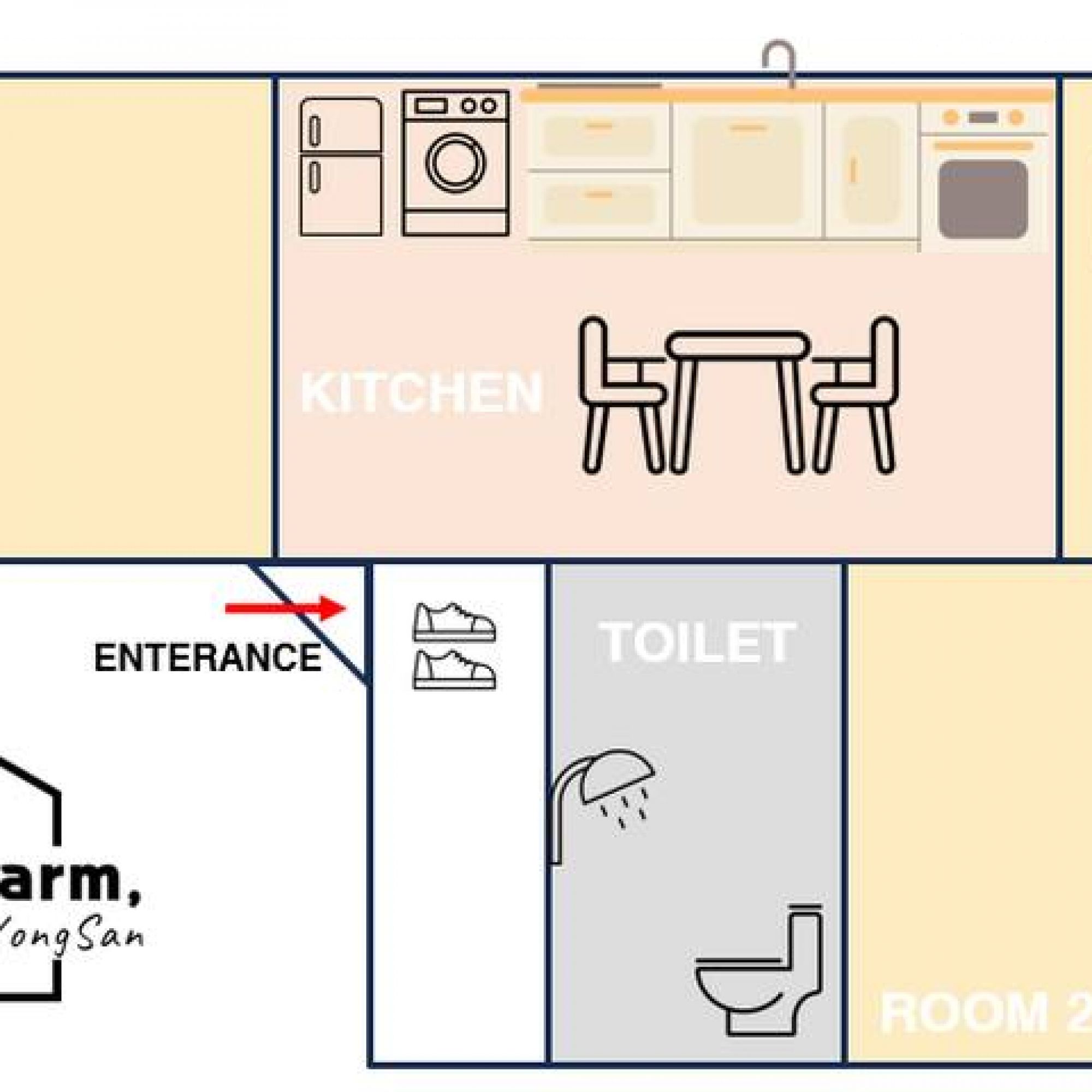 ?地点:首尔市中心?空间:迷人而舒适的空间??♀️ 主人:友好而亲切的主人?住宿描述? ▶️“STAY CHARM, 龙山”是位于首尔旅游中心龙山区一个安静的住宅区内的舒适温馨的住宿,距离孝昌公园站(6号线、京义中央线)5号出口有2分钟步行路程。只需10至20分钟即可抵达首尔主要旅游景点梨泰院、弘益大学站和明洞。旅馆距离便利店和早午餐咖啡馆有不到 1 分钟步行路程,距离韩国传统市场龙门市场有 3 分钟步行路程。 ▶️距离有连接仁川国际机场的机场铁路的孔德站仅一站地铁,还可轻松前往BTS所属经纪公司HYBE所在的龙山站。 ▶️ 详情 - 下午 3 点入住 / 上午 11 点退房(提前入住、延迟退房、行李寄存服务需事先获得批准) - 入口门上方安装了闭路电视,以确保客人的安全(如果进入的人数超过预订人数,您将被要求离开并产生额外费用) - 安装了高速免费 WIFI 和智能电视 - 住宿内部最近经过翻新,提供 52 平方米的温馨舒适的空间。 - 位于半地下室的4楼至5楼,其中一层为专用层。每个房间都有大窗户,有利于通风。 - 我们为每位客人提供新的床上用品和清洁服务,并定期进行消毒和杀菌。住宿信息▶️ 最多可容纳6人住宿(基本2人) - 入住时间 下午3点 / 退房时间 上午11点 - 最多可容纳6人(超过2人,每人需额外支付20,000韩元) - 5人以上预订时,提供地板垫或将3号房的沙发床变成床 ▶️ 住宿情况(3间房,3张床)?房间 1(1 张大床、边桌、立镜、衣架、边桌、吹风机)?房间 2(1 张大床、边桌、全身镜、空调)? 3号房(1张大沙发床、边桌、立式镜子、空调、43英寸大型智能电视)?️?厨房和客厅(冰箱、洗衣机、电磁炉、微波炉、电热水壶、餐桌、餐具(杯子、酒杯、叉子、刀子等)、炊具)?浴室(毛巾、洗发水、护发素、沐浴露、肥皂、卫生纸、吹风机等)?附近旅游景点 (地铁) - 龙山站 (龙山 I'Park 购物中心、KTX 火车站) 3 分钟 - 梨泰院站 (解放村、战争纪念馆) 5 分钟 - 弘益大学站 (弘大大街、延岩洞) 7 分钟 - 首尔站 (崇礼门、德寿宫) 9 分钟 - 望远站 (望远市场、望理团路) 10 分钟 - 会贤站 (南大门市场、新世界百货) 13 分钟 - 明洞站 (南山塔、明洞购物街) 14 分钟 - 光化门站 (光化门广场、历史博物馆) 15 分钟 - 东大门历史文化公园站 (东大门、DDP) 16 分钟 - 钟路三街站 (宗庙、仁寺洞、清溪川) 20 分钟 - 安国站(昌德宫、北村韩屋村)21分钟~景福宫站(景福宫、国立故宫博物院)23分钟?其他预防措施? ✔️ 请务必在住宿内脱鞋,并不要染发。 (如果弄脏地板和床上用品,您将需要支付费用。)✔️除预订者外,其他人员禁止入内。为了客人的安全并检查入住的客人数量,入口门上方安装了闭路电视。 (如果有预订人数以外的人数进入房间,您可能会被要求离开,并可能收取额外费用。)✔️提前入住和延迟退房要求每小时需额外支付10,000韩元的费用。请提前咨询。 ✔ 住宿内的寝具、地毯、沙发等物品若发生污染,或电子设备等设施损坏、丢失,可能会收取修复费用以恢复原状。 ✔ 可应要求免费提供滚筒洗衣机专用洗涤剂。 (如有需要,请在入住前提前询问。)️️✔如需行李寄存,请提前询问。 ❌馆内禁止吸烟(包括电子烟)。如果因吸烟而产生烟雾,火灾警报就会响起,消防部门也会紧急出动。 ❌禁止携带宠物 ❌禁止烹制油多或气味浓烈的食物(烤鱼、五花肉、香料、榴莲) 请注意,违反禁止物品将被处以30万韩元罚款,并立即驱逐,且不予退款。此住宿是Wehome共享住宿的特殊住宿,因此可以合法出租。 (特別编号:wehome_me_199010) 3個房間,住宿內所有設施(1號房,2號房,開放式房,客廳,廳房間,廳堂和廚房,洗手間等) 步行2-3分锺即可抵达地鐵。 (6号线孝昌公园站)